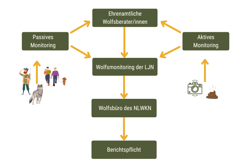 Das Wolfsmonitoring in Niedersachsen wird in erster Linie passiv durchgeführt, die Meldung von Wolfshinweisen (z.B. Sichtungen, Fotofallenaufnahmen, Risse) erfolgt durch Jagdscheininhaber, ehrenamtliche Wolfsberater oder andere Naturnutzer. Aktive Monitoringmaßnahmen (z.B. Fotofallenmonitoring, Losungssuche) ergänzen das Monitoring und helfen das lokale Wolfsvorkommen besser zu analysieren.